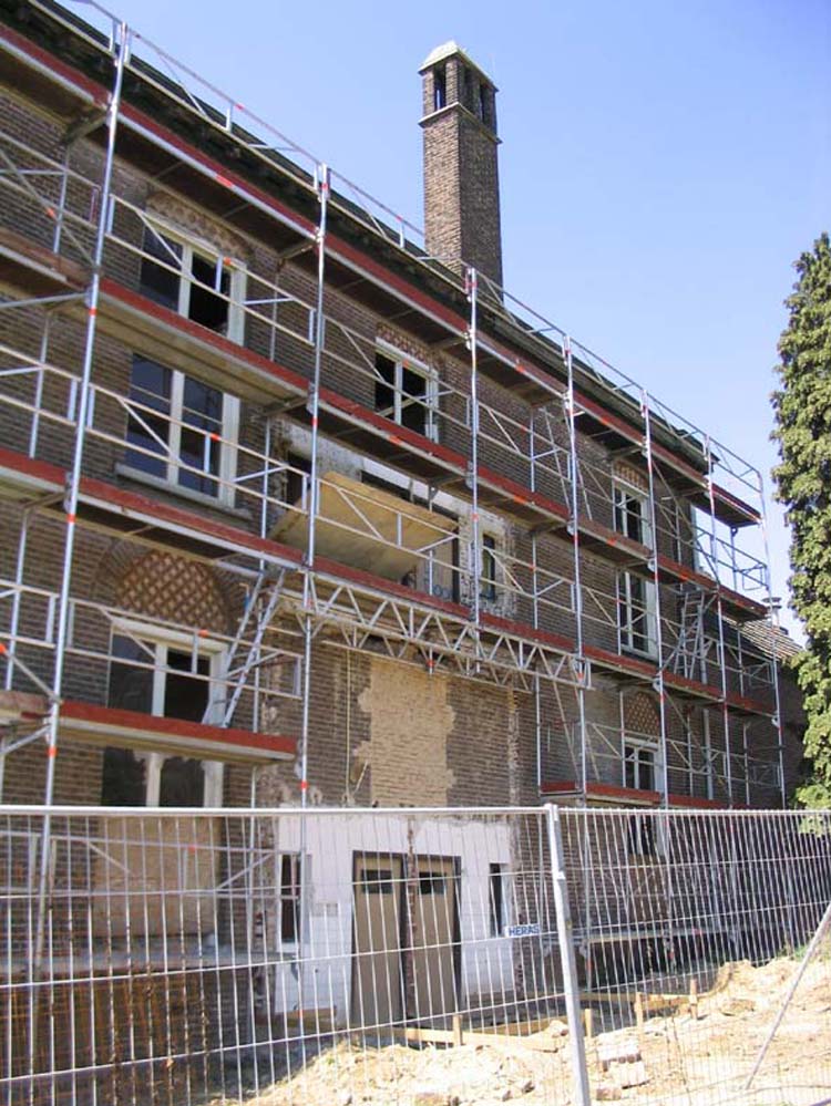 De voorgevel in de steigers.